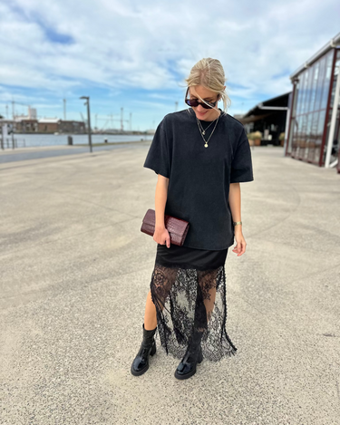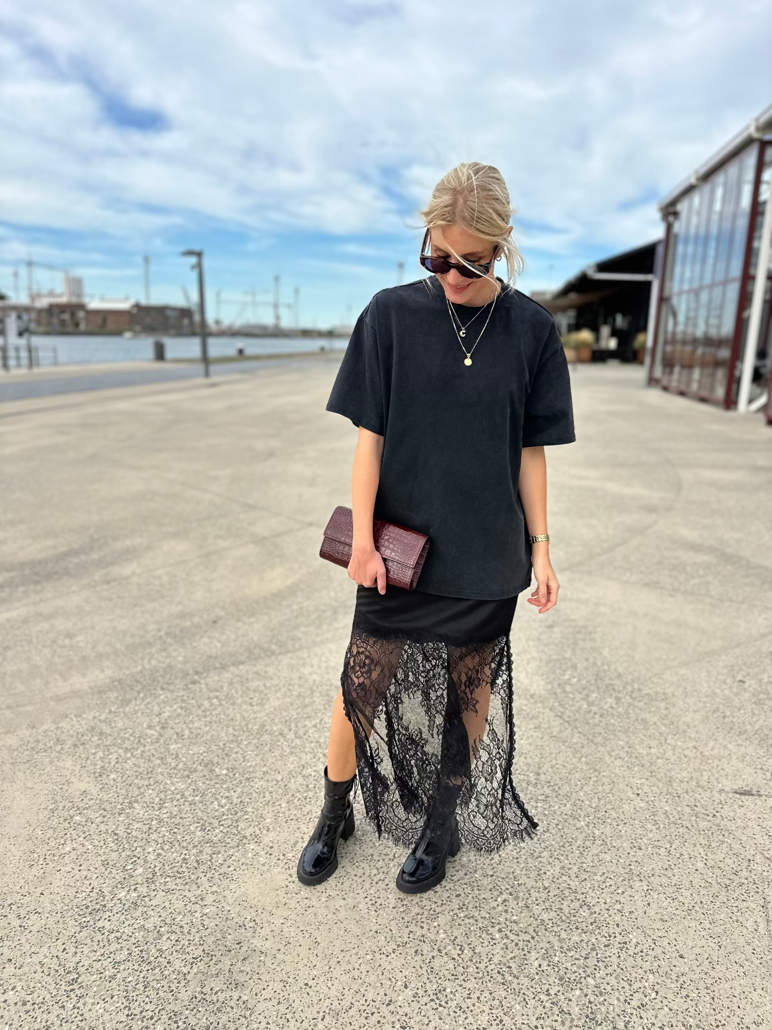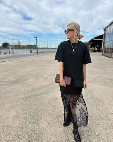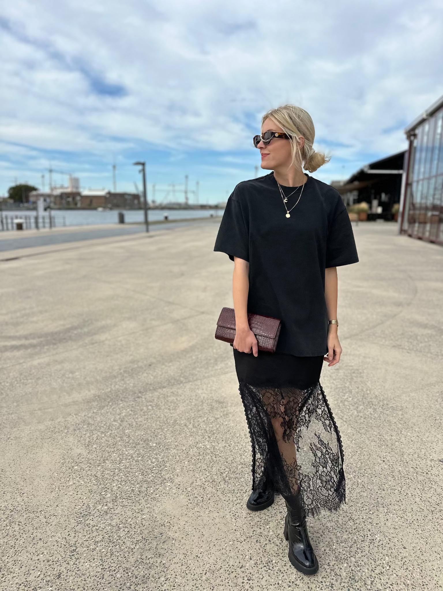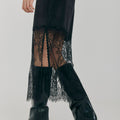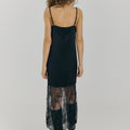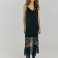 A sleek and elegant slip dress with a lace hem for a feminine, textured finish. Crafted from a soft viscose blend — perfect for layering or wearing alone for a chic, minimal look.