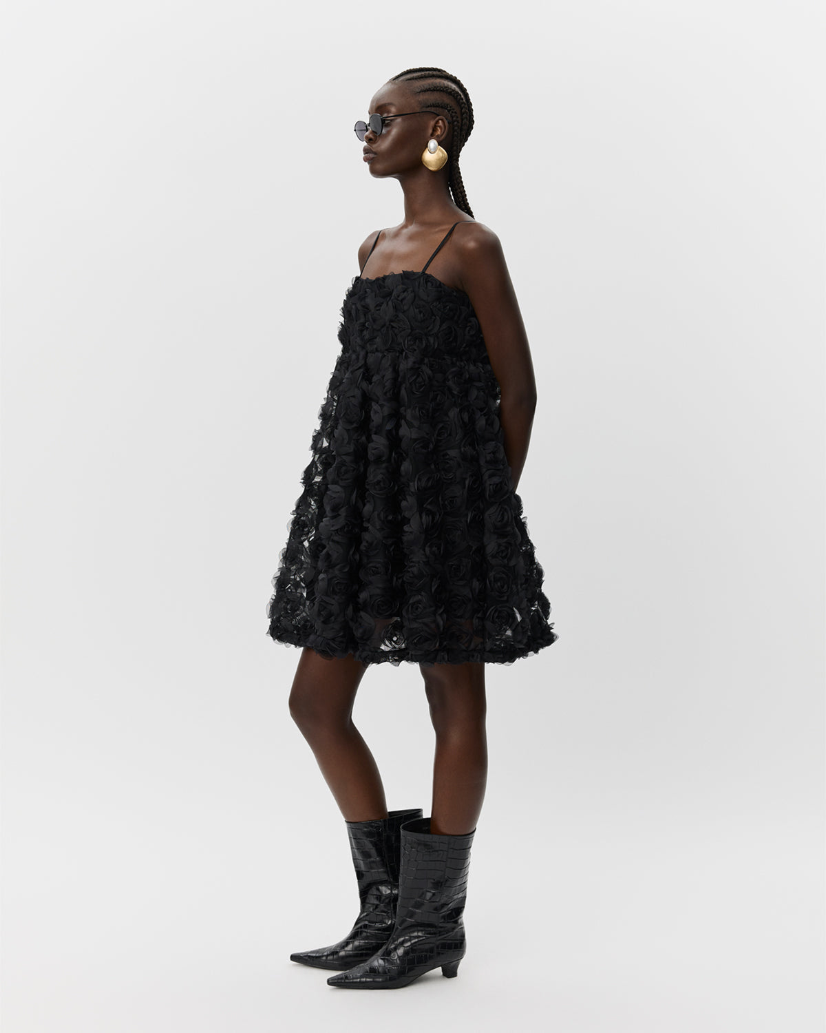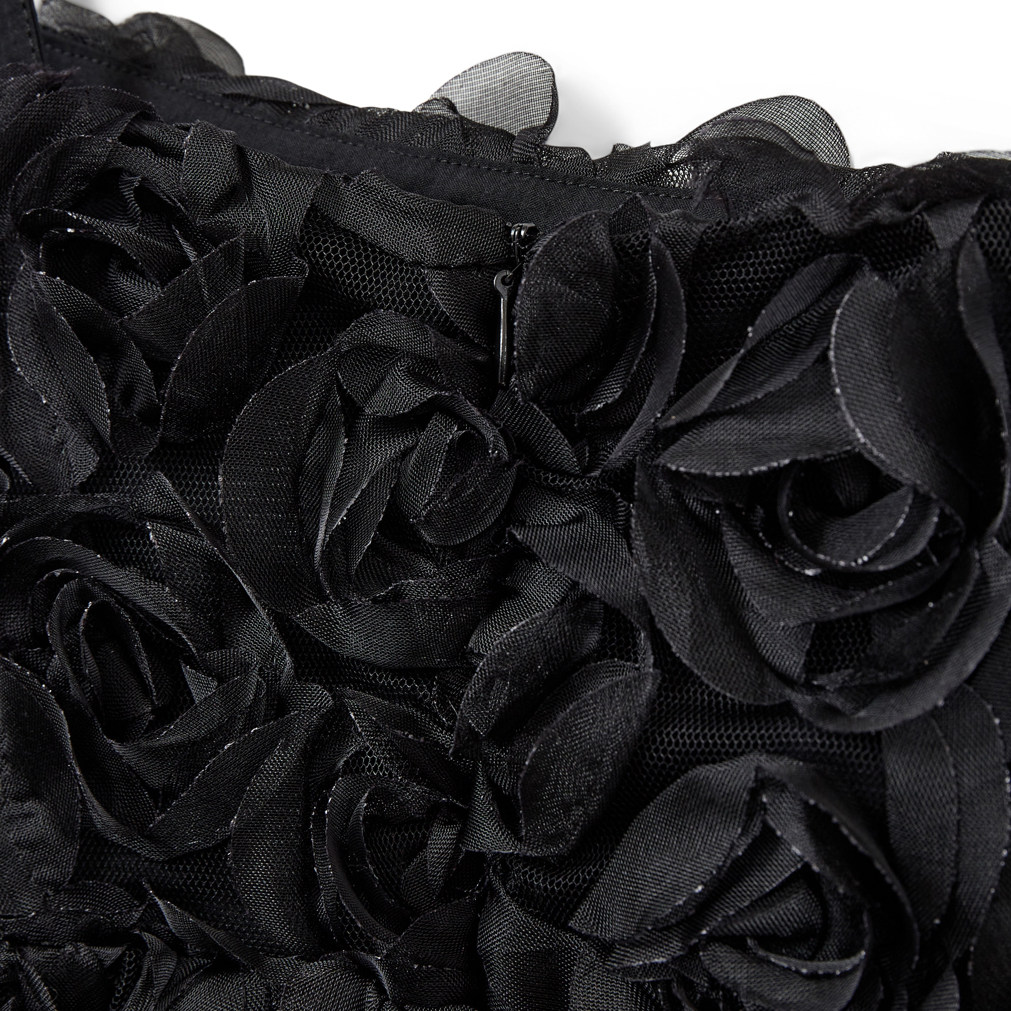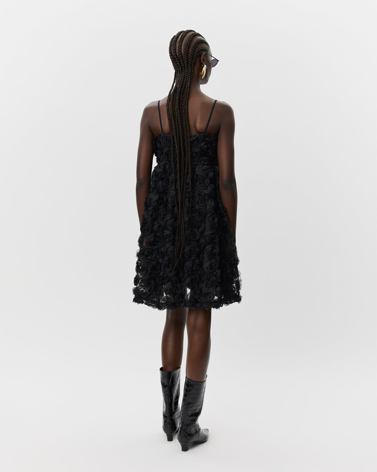 Black mini dress with thin straps, covered in three-dimensional roses with mesh effect.