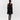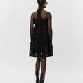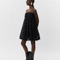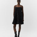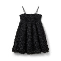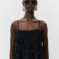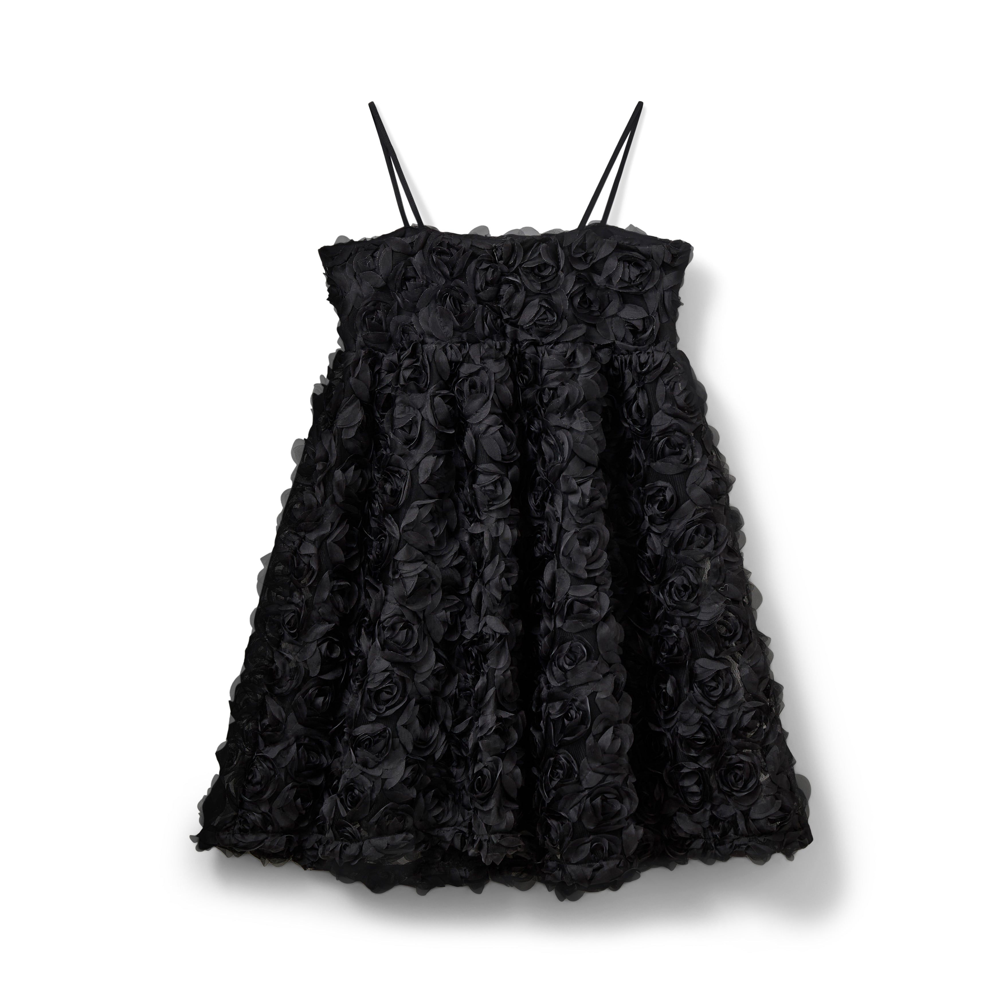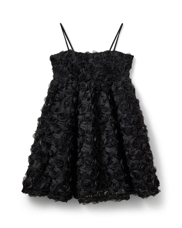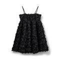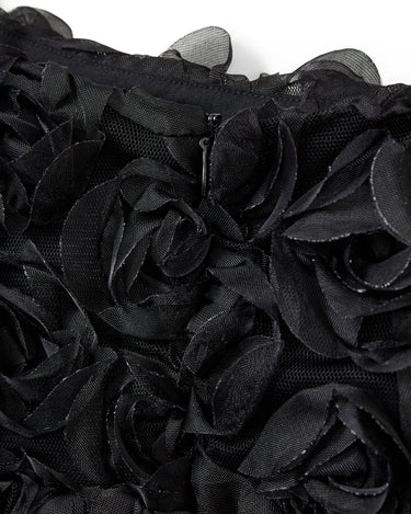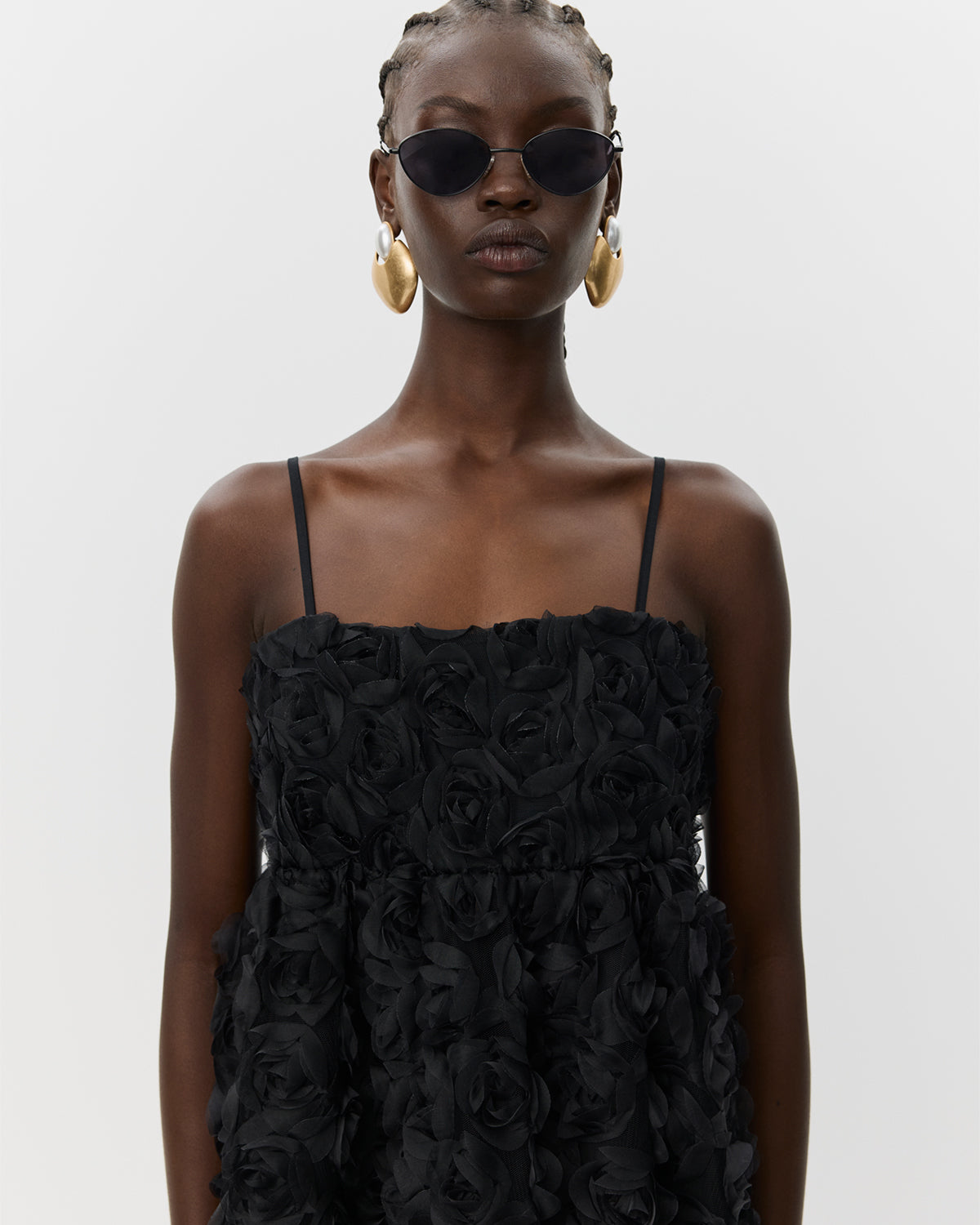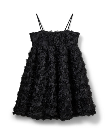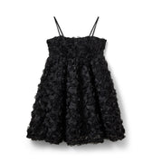Black mini dress with thin straps, covered in three-dimensional roses with mesh effect.