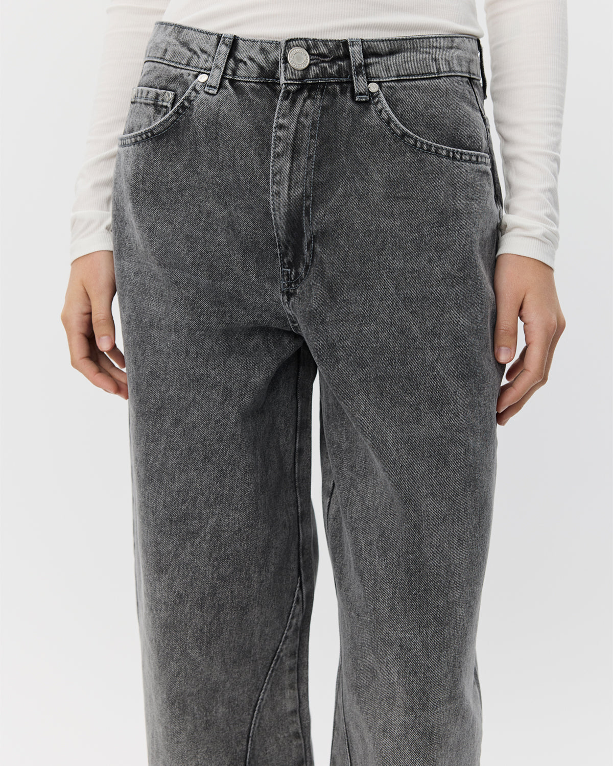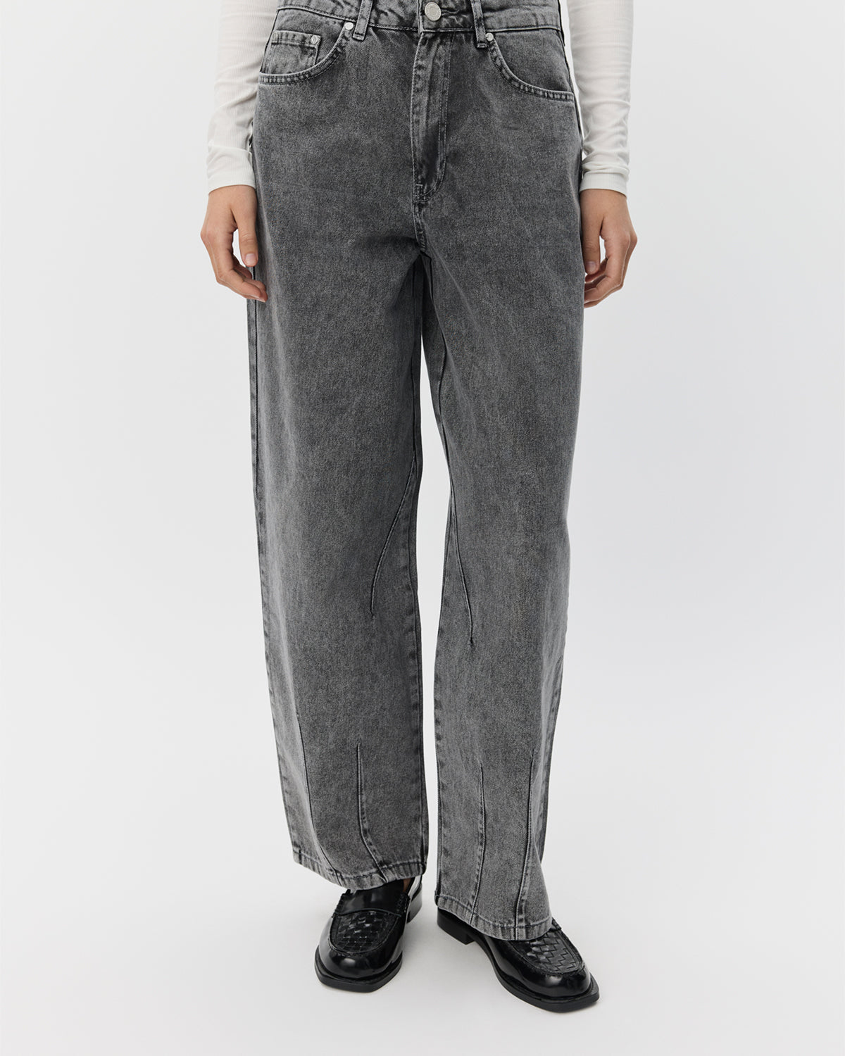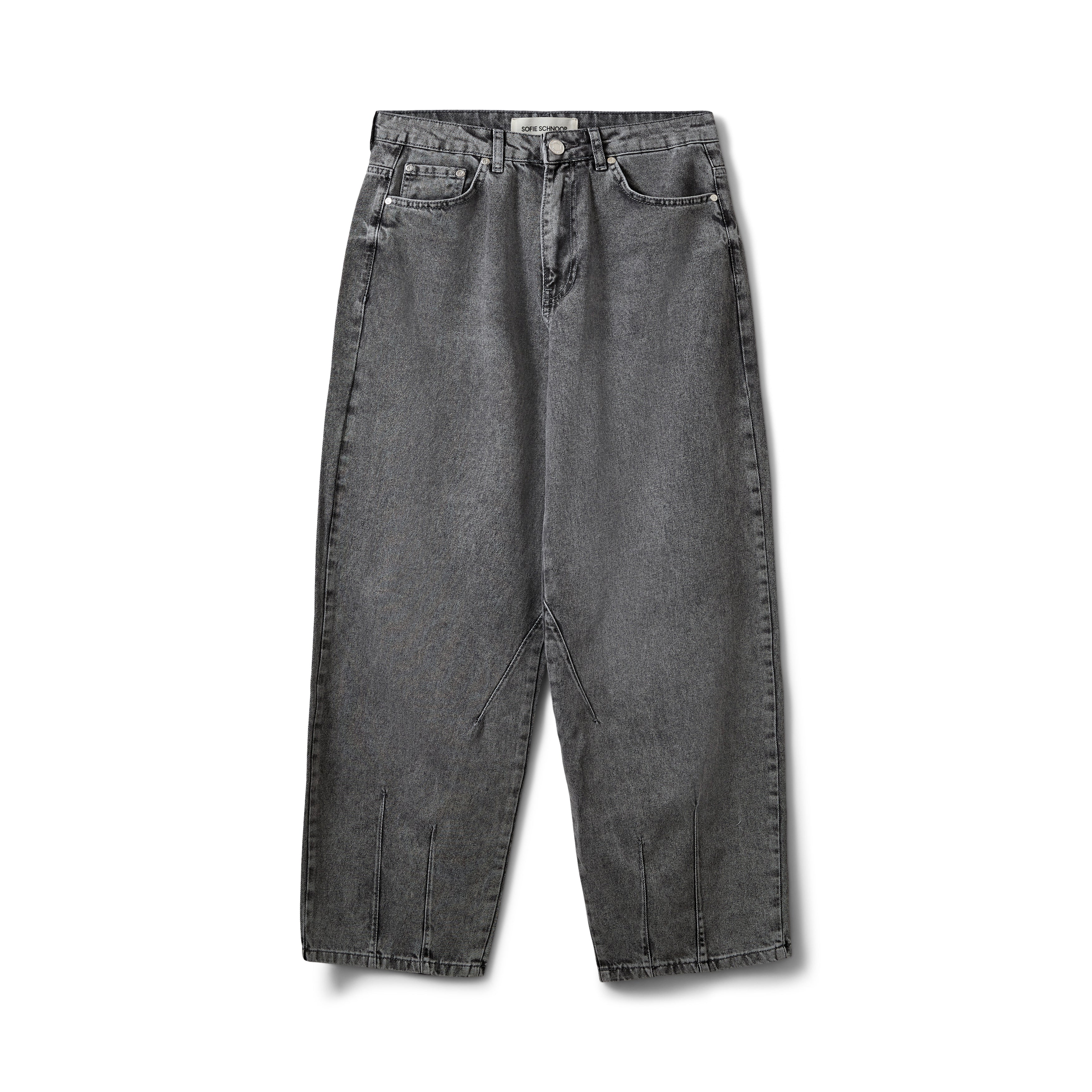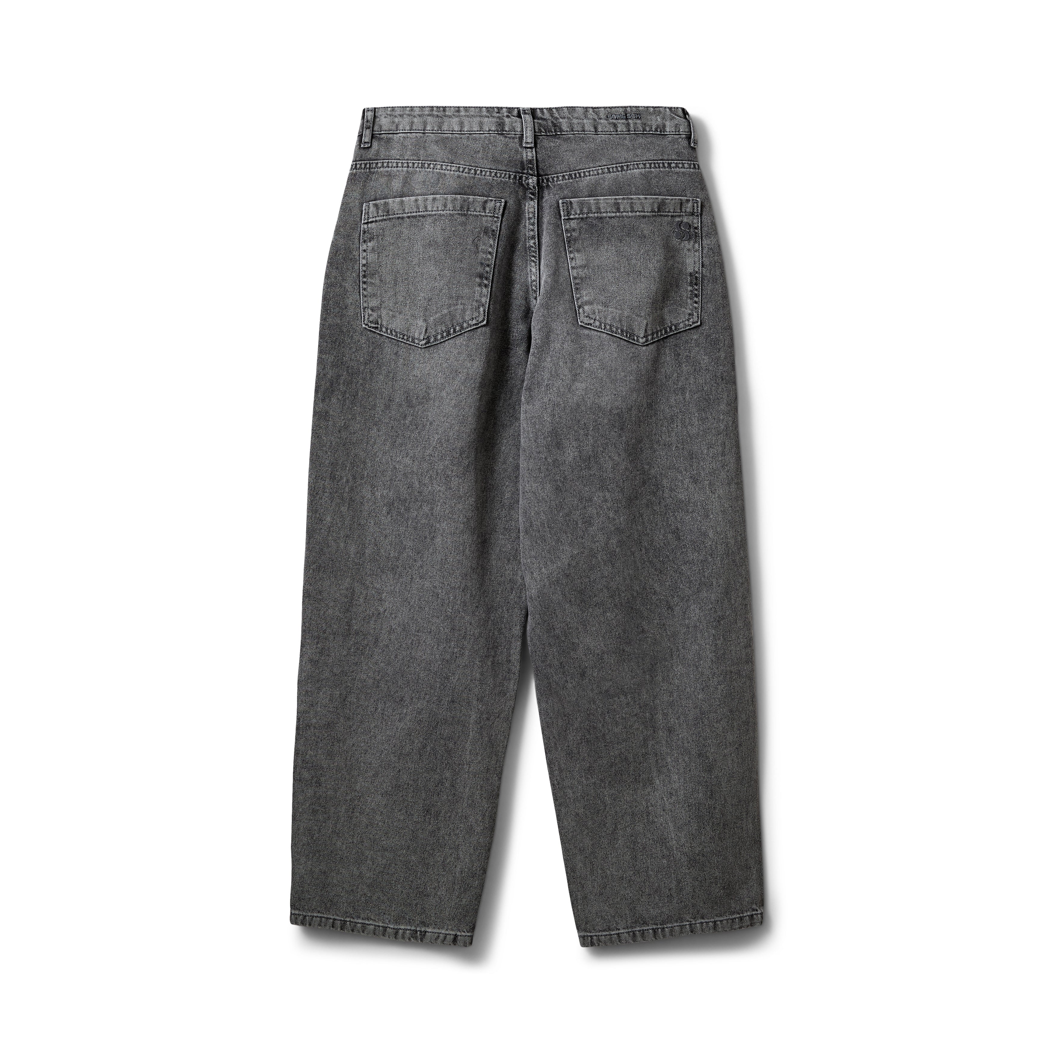 Grey washed barrel jeans - mid waist with a small embroidered logo on the back pocket.
